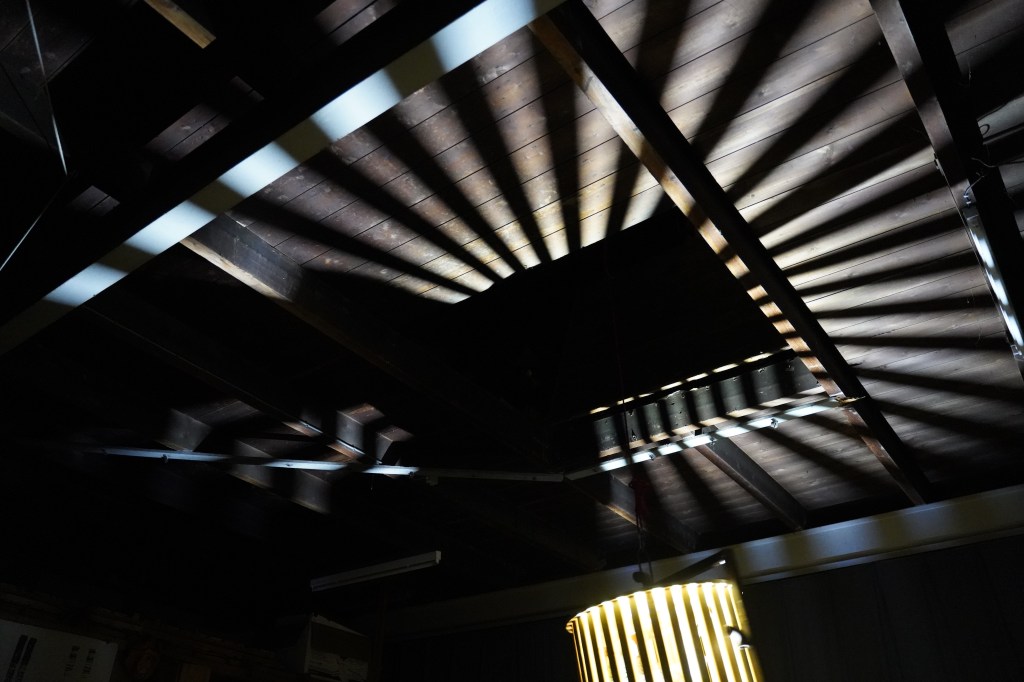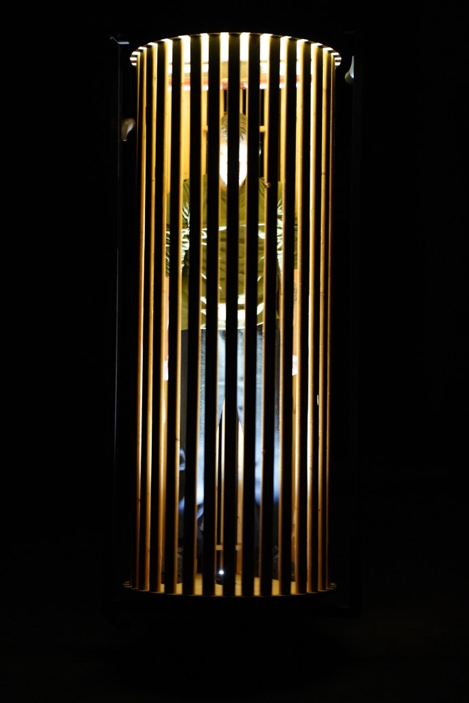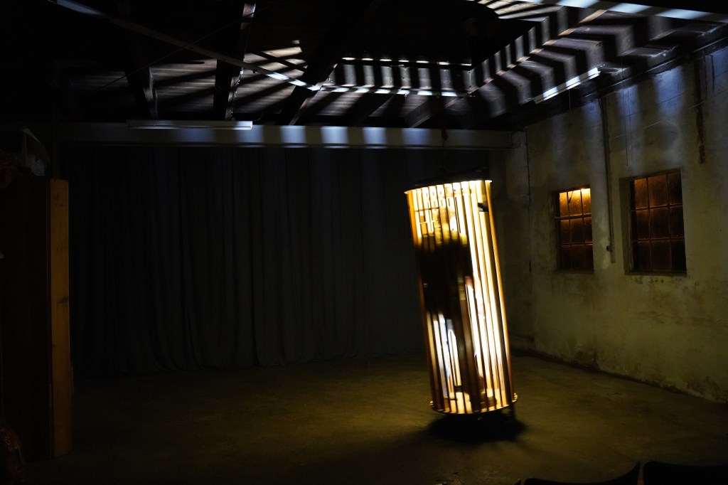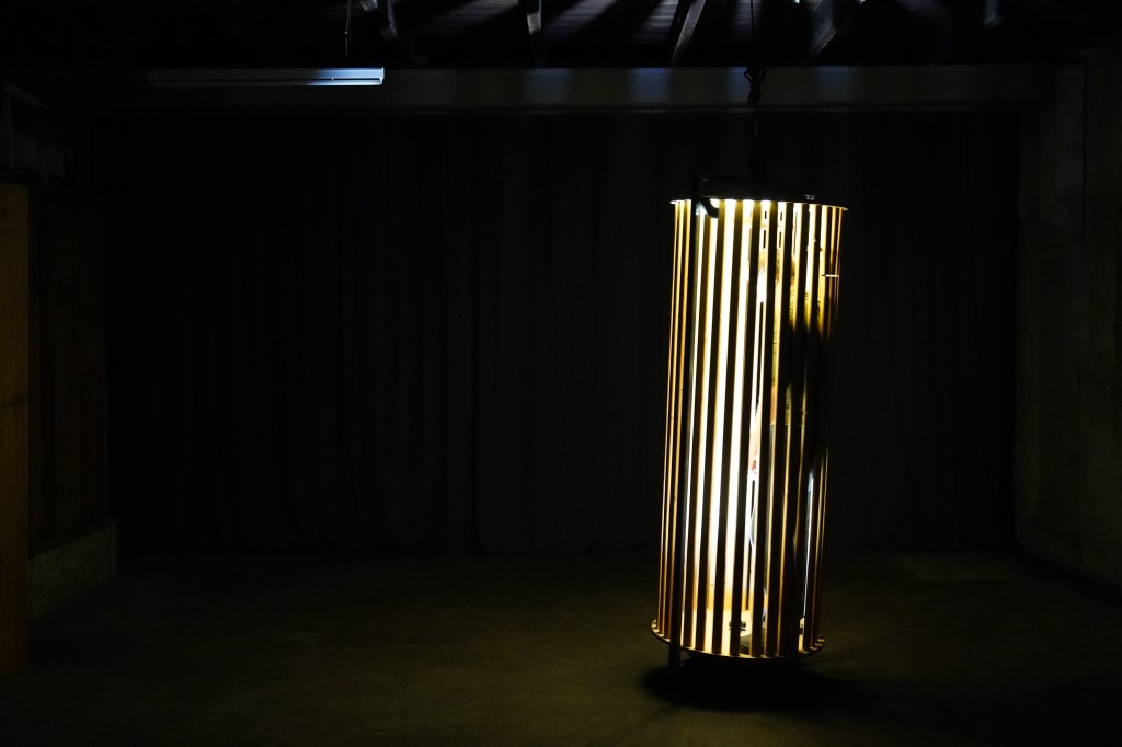 This lantern serves to see within. It rotates on a swaying axis, turning itself ever inward. The single light luminates a body subjected to it’s own handling.